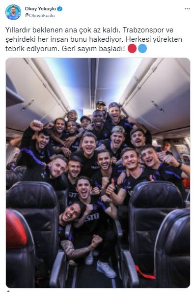 Yokuşlu paylaşımında, “Yıllardır beklenen ana çok az kaldı. Trabzonspor ve kentteki her insan bunu hakediyor. Herkesi yürekten tebrik ediyorum. Geri sayım başladı!” tabirlerini kullandı. Okay Yokuşlu’nun bu paylaşımı binlerce etkileşim aldı.