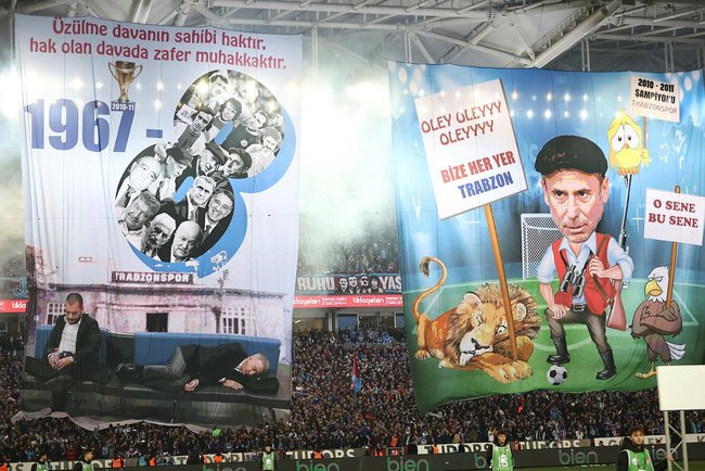 Taraftarlar, maç öncesi maraton tribününde iki farklı dev pankart açtı. Pankartların birinde avcı kıyafetiyle Abdullah Avcı yer alırken, sırtındaki tüfeğin ucunda bir kanarya, yerde bir aslan ve ‘O sene bu sene pankartı’ tutan bir kartal yer aldı. Pankartta ayrıyeten “2010-2011 şampiyonu Trabzonspor” ve “Oley oley bize her yer Trabzon” yazıları da yer aldı.