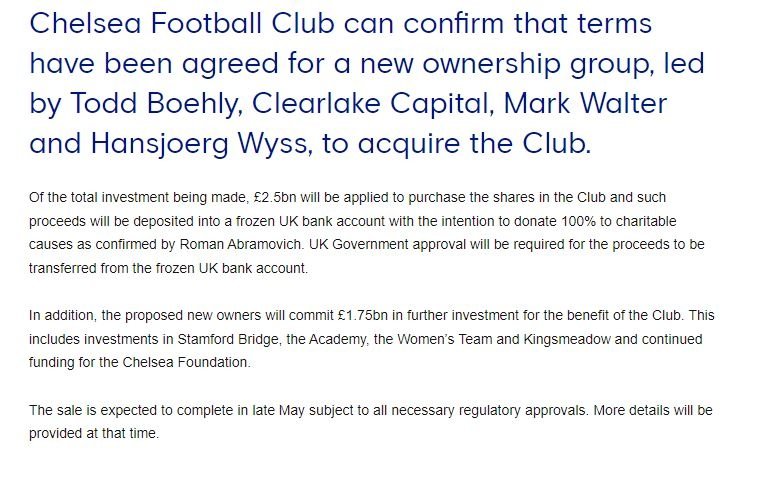 İngiltere Premier Lig takımlarından Chelsea yeni sahibini buluyor. Kulüp yaptığı açıklamada, Los Angeles Dodgers beyzbol ekibinin da ortaklarından olan Todd Boehly’nin yöneticisi olduğu bir küme yatırımcının 5 milyar euro önerdiğini ve muahedenin yakın olduğunu duyurdu. Gerekli prosedürlerin ise mayıs ayı sonlarında tamamlanmasının beklendiği kaydedildi.