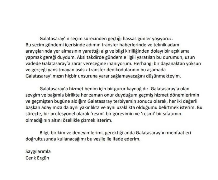 Cenk Ergün yazılı açıklamasında, kongre sürecinde isminin teknik yönetici arayışları ve transfer haberlerinde yer alması nedeniyle açıklama yapma gereği duyduğunu vurgulayarak, “Aksi takdirde gündemle ilgili yaratılan bu durumun, uzun vadede Galatasaray’a ziyan vereceğine inanıyorum. Rastgele bir destekten mahrum ve gerçeği yansıtmayan temelsiz transfer dedikodularının bu basamakta Galatasaray’ımızın hiçbir ögesine fayda sağlamayacağını düşünmekteyim.” tabirlerini kullandı.