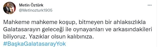 Metin Öztürk, karar sonrası yaptığı paylaşımda, “Mahkeme mahkeme koşup, bitmeyen bir ahlaksızlıkla Galatasarayın geleceği ile oynayanları ve ardındakileri biliyoruz. Yazıklar olsun kalıbınıza. #BaşkaGalatasarayYok” dedi.