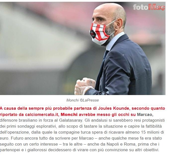 A Spor editörlerinden Bora Salgın’ın İtalyan basınına dayandırdığı habere nazaran; Sevilla’nın sportif yöneticisi Monchi, Galatasaray’dan Marcao’yu gözüne dikti.