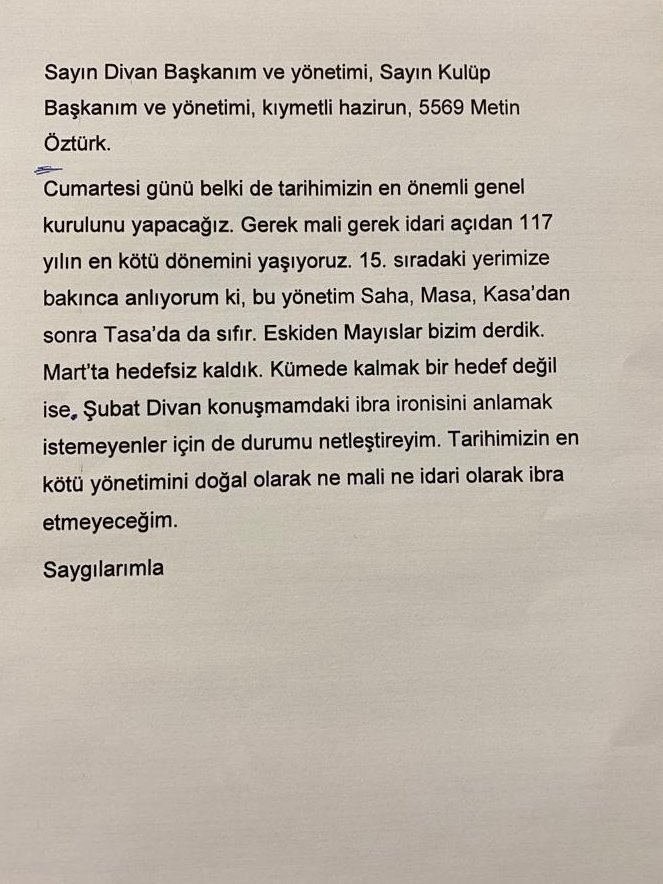 Metin Öztürk, “Cumartesi günü tarihimizin en kıymetli genel konseyini yapacağız. Gerek mali gerek idari açıdan 117 yılın en makûs periyodunu yaşıyoruz. 15. sıradaki yerimize bakınca anlıyorumki bu idare, saha, masa, kasadan sonra tasada da sıfır! Tarihimizin en makus idaresini ne mali ne idari taraftan ibra etmeyeceğim!” sözlerini kullandı.