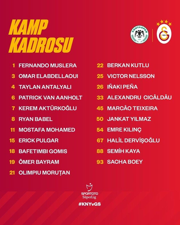 Galatasaray, İttifak Holding Konyaspor maçı kamp takımını açıkladı. Çaykur Rizespor maçında sonradan oyuna girmesine karşın 2 asist yapan ve gösterdiği performansla alkış alan Sofiane Feghouli, kamp takımı dışında bırakıldı. Galatasaray’ın açıkladığı kamp takımında 13 yabancı bulunurken, Cezayirli oyuncuyla ilgili rastgele bir sakatlık bildirimi de yapılmadı.