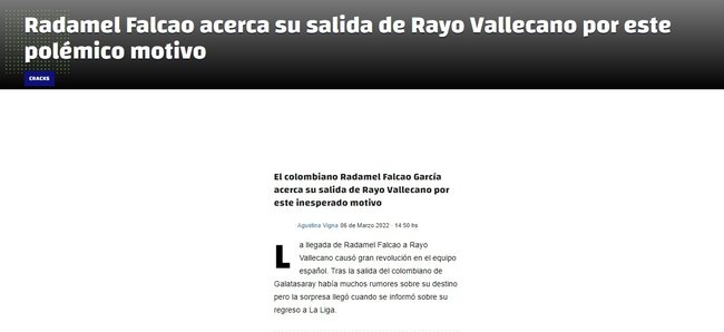 Haberin ayrıntılarında, Vallecano’nun dönemin bir kısmında 8 maç üst üste mağlup olması ve Falcao’nun kas sakatlıkları oyuncunun moralini bir epey düşürdüğü bilgisine yer verildi. Kolombiyalı golcünün bu sebeple dönem sonunda yeni bir kadroya imza atmak istediği tabir edildi.