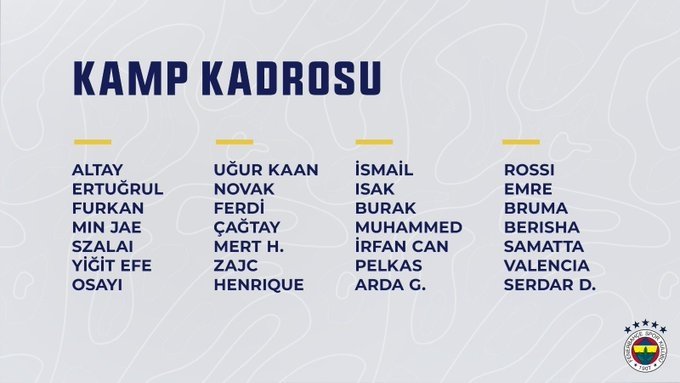Yeni dönem hazırlıklarını sürdüren Fenerbahçe, Avusturya kampı takımını duyurdu. Spor Toto Üstün Lig’de yeni dönem öncesi hazırlıklarına devam eden sarı-lacivertlilerin Avusturya kampı takımına yeni transfer Emre Mor da dahil edildi. Bu ortada Fenerbahçe’den, takımda yer almayan isimlerle ilgili bir açıklama geldi. Duyuruda, “Kamp takımımızda olmayan isimler tedavi emelli İstanbul’da kalmıştır” denildi.