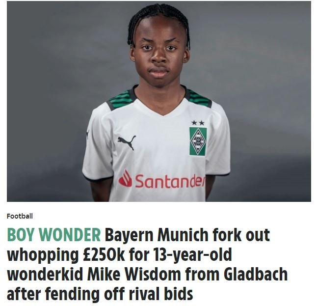 Almanya Bundesliga gruplarından Bayern Münih, değerli bir ismi altyapısına transfer etti. The Sun’da yer alan habere nazaran Bavyera grubu, ezeli rakibi Borussia Dortmund ve Bayer Leverkusen’in de istediği 13 yaşındaki Alman futbolcu Mike Wisdom’ı altyapısına kazandırdı.