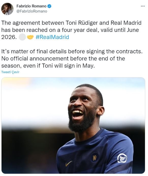 İtalyan gazeteci Fabrizio Romano’nun paylaştığı bilgilere nazaran eflatun-beyazlı kadro, Chelsea forması giyen Alman stoper Antonio Rüdiger’le 4 yıllık kontrat konusunda muahedeye vardı. Fakat resmi açıklamanın dönem sonundan evvel yapılmayacağı belirtildi.